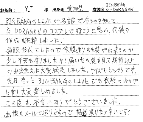 BIGBANGのLIVEが名古屋で有るのを知って、G-DORAGONのコスプレで行こうと思い、衣装の作成を依頼しました。通販形式でしたので依頼通りの衣装が出来るのか少し不安もありましたが、届いた衣装を見て期待以上の出来栄えに大変満足しました。サイズもピッタリです。先日、有ったBIGBANGのLIVEでも衣装のおかげも有り大変楽しめました。この度は本当にありがとうございました。画像をメールで送りますので掲載頂けたら幸いです!
