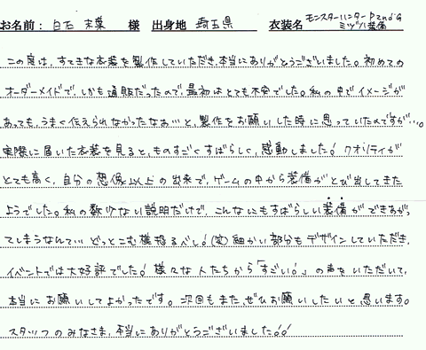 この度はすてきな衣装を製作していただき、本当にありがとうございました。